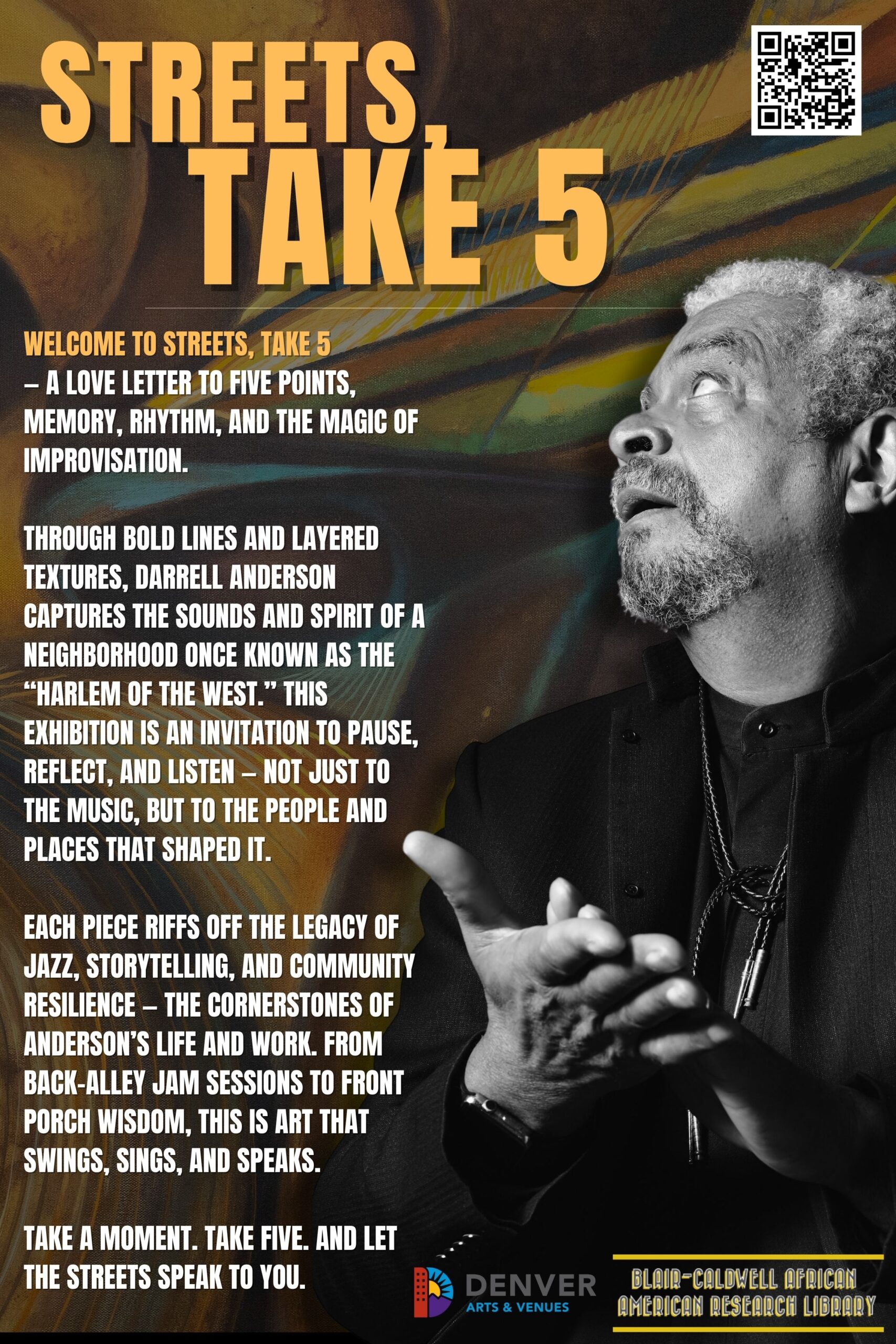 “Streets, Take 5” is a jazz-infused visual meditation on the soul of Five Points—Denver’s historic Black neighborhood once known as the “Harlem of the West.” Through a series of vivid, rhythmic works, artist Darrell Anderson captures the improvisational energy of the streets he grew up in, paying tribute to the musicians, dancers, storytellers, and everyday people who shaped its tempo. Running June 20th, 2025-September 27th at Blair-Caldwell African American Research Libray. Funded by Denver Arts and Venues.